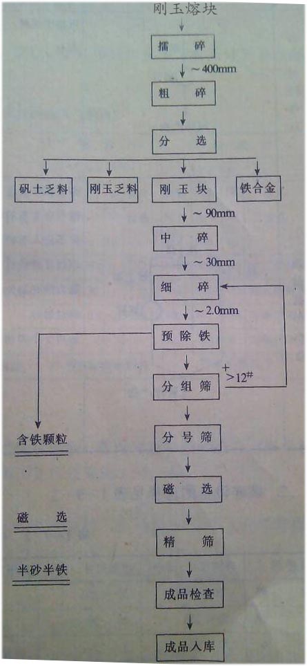 剛玉磨料的制粒加工是將冶煉合格的剛玉塊破碎為顆粒形態,并按照一定的尺寸范圍分成各種不同的粒度同時分離出混雜在磨料中的鐵質,以滿足制作各種磨具及不同磨削要求之需求。